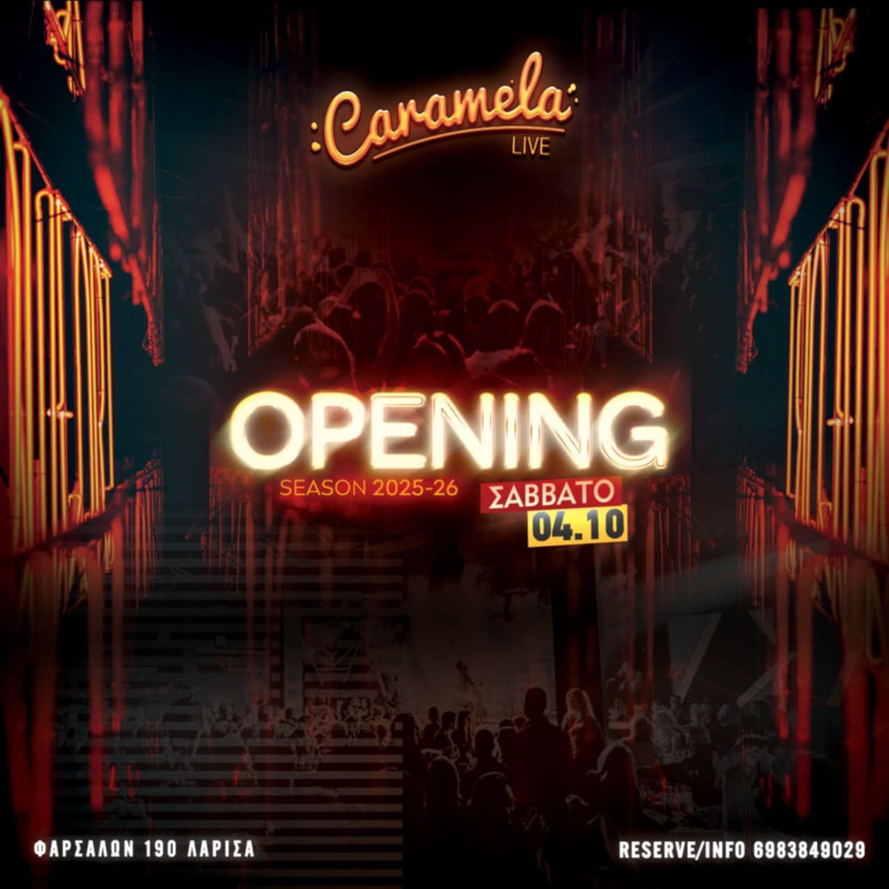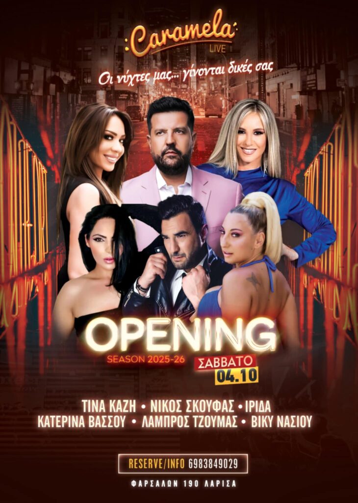 Η αναμονή τελειώνει! Το Caramela Live, το κορυφαίο κέντρο διασκέδασης της Λάρισας, ανοίγει και πάλι τις πόρτες του!Πρεμιέρα Σάββατο 4 Οκτωβρίου και κάθε Παρασκευή και Σάββατο!Έναρξη με τον πιο εκρηκτικό τρόπο! Μουσική, ρυθμός, κέφι και διασκέδαση μέχρι το πρωί!Ετοιμαστείτε για τη νύχτα που θα γράψει την αρχή μιας ακόμα αξέχαστης σεζόν στο Caramela! Φαρσάλων 190, Λάρισα